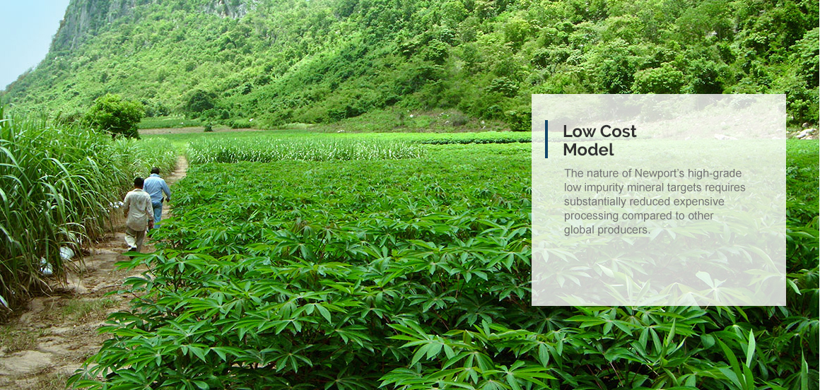 The nature of Newport’s high-grade low impurity mineral targets requires substantially reduced expensive processing compared to other global producers.